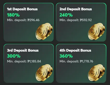 - Bonus sa unang deposito. Ang unang deposito ay karaniwang may kasamang malaking bonus, tulad ng 180% match, o mas mataas pa sa panahon ng mga espesyal na promo, gaya ng 300% bonus kapag nag-deposito sa loob ng 7 minuto matapos ang pagrerehistro, na may maximum na $20,000 o katumbas nito sa ibang mga currency.